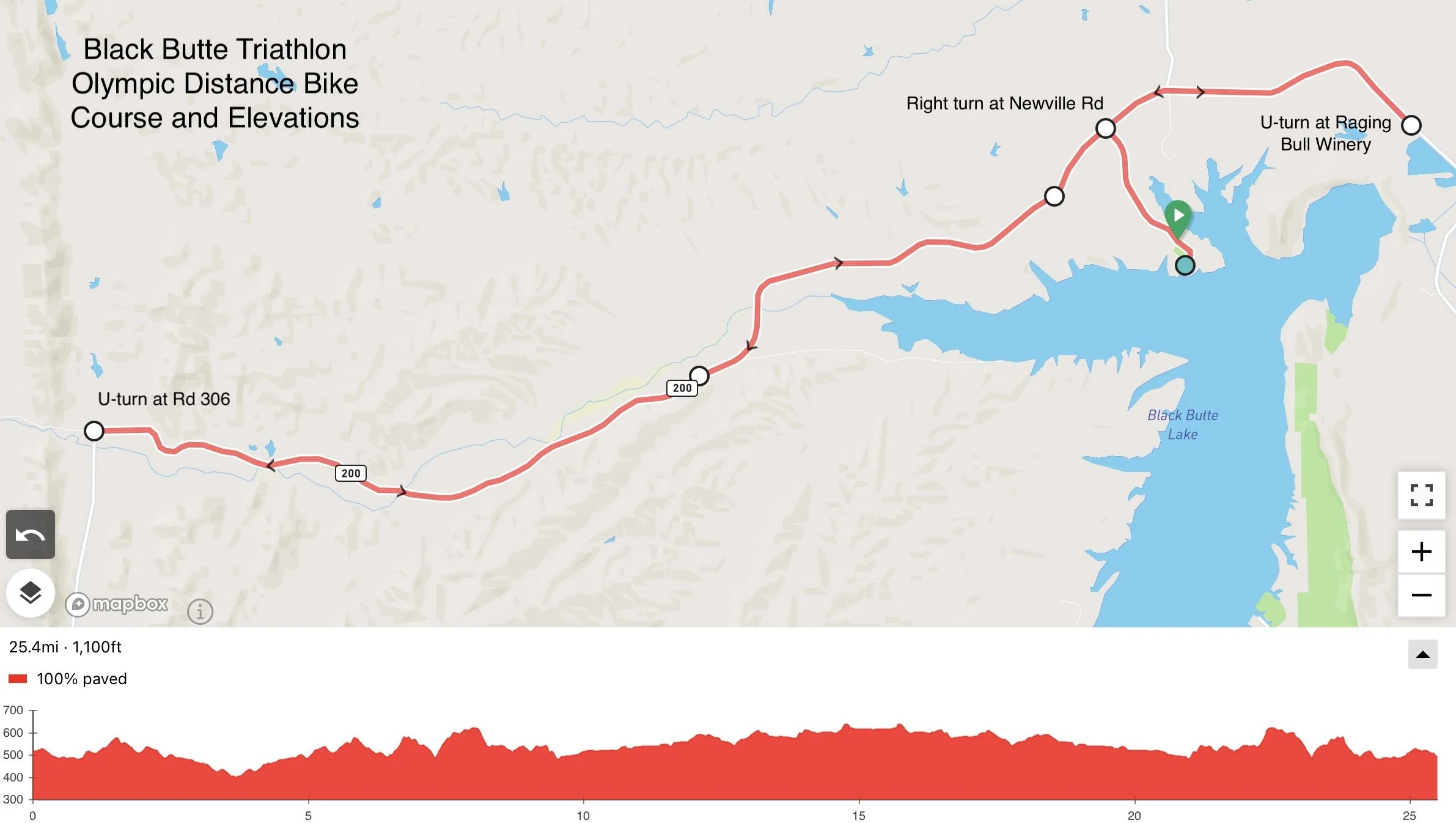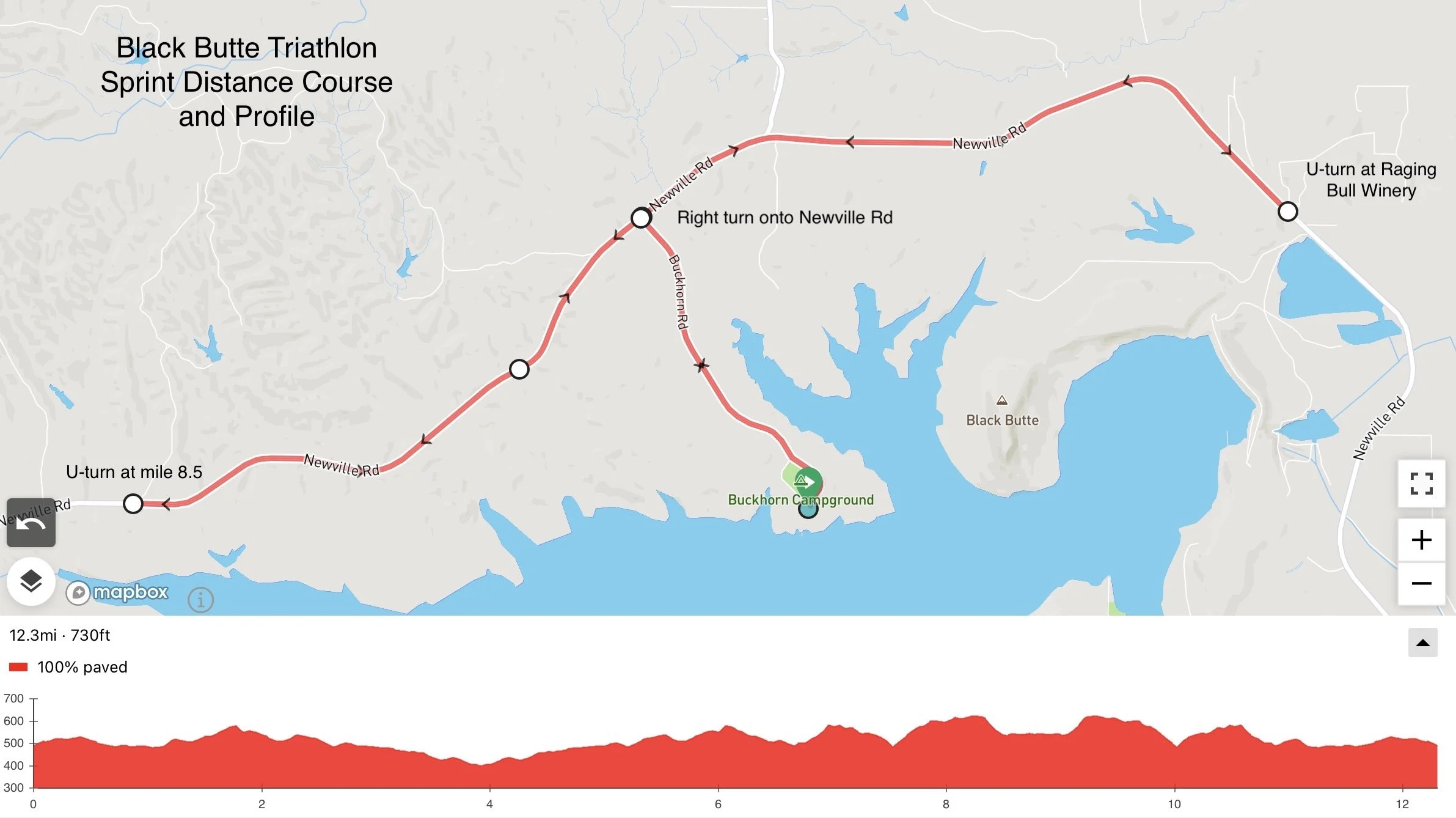 The bike course exits transition and heads North on the park road. At Newville Rd, all riders turn right and proceed to the Raging Bull Winery. At the winery, all riders make a U-turn and ride West on Newville Rd. Sprint and Duathlon racers will turn around after at approximately mile 8.5. Olympic racers will continue to the turnaround at Rd 306. All riders return to transition after their repective turnarounds. A mandatory foot-down stop is required at the exit of the park before turning onto Newville Rd. Maps and elevation profiles are provided below.